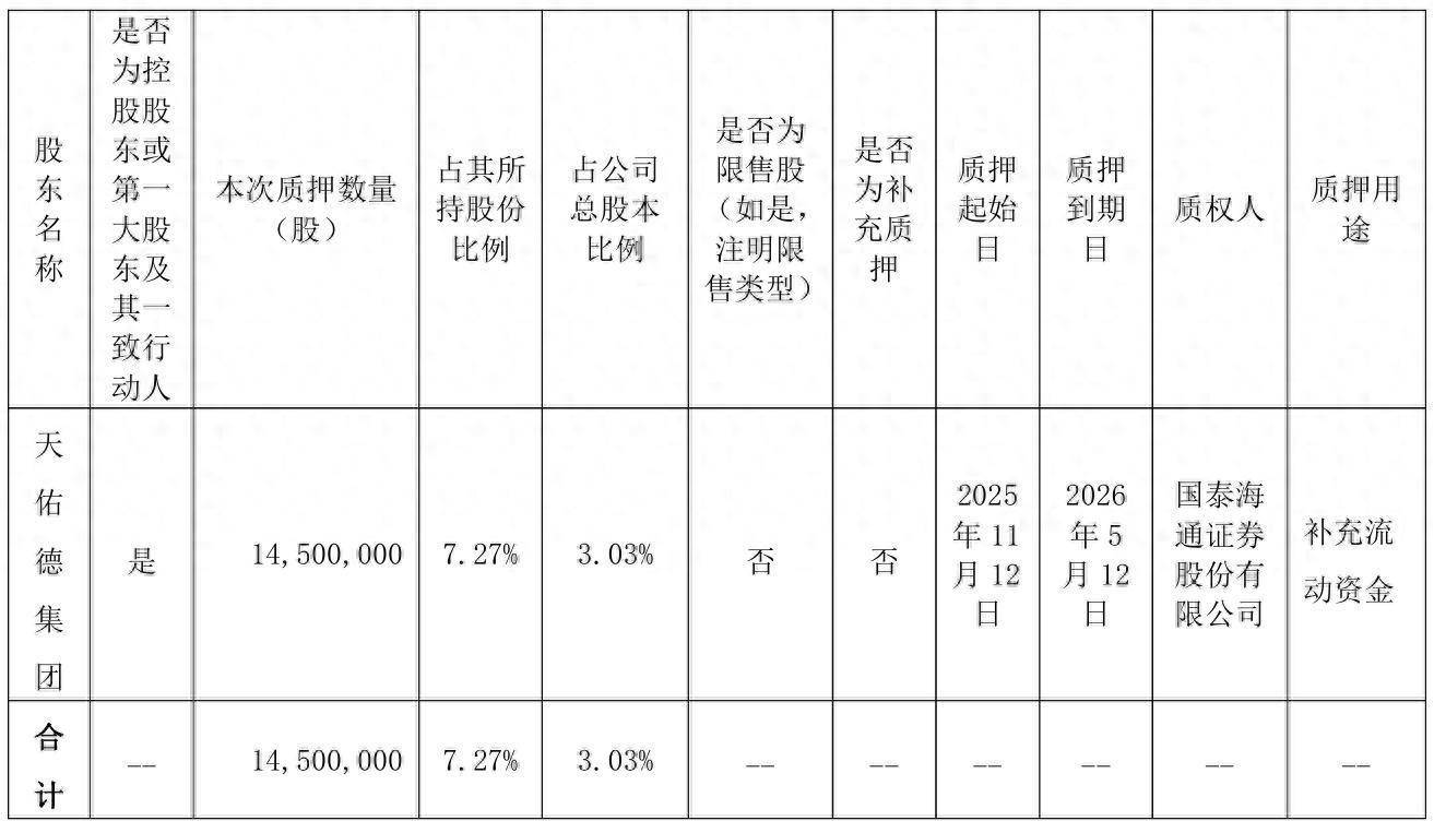 11月14日,天佑德酒(002646)发布公告,控股股东天佑德集团将其持有的1450万股股份办理质押,占其所持股份的7.27%及公司总股本的3.03%。